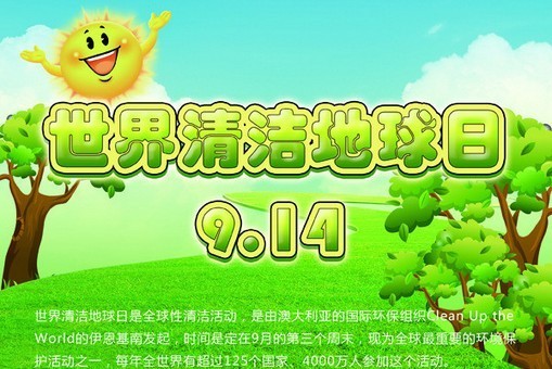 世界清潔地球日又名世界清潔日,英文為Clean Up the World Weekend (CUW Weekend),是全球性清潔活動(dòng),是由澳大利亞的國(guó)際環(huán)保組織Clean Up the World的伊恩基南發(fā)起,時(shí)間是定在9月的第三個(gè)周末,現(xiàn)為全球非常重要的環(huán)境保護(hù)活動(dòng)之一,每年全世界有超過(guò)125個(gè)國(guó)家、4000萬(wàn)人參加這個(gè)活動(dòng)。2006年的世界清潔日活動(dòng)時(shí)間為9月15日至17日3天。也有參與組織和個(gè)人把每年的9月14日作為活動(dòng)時(shí)間。