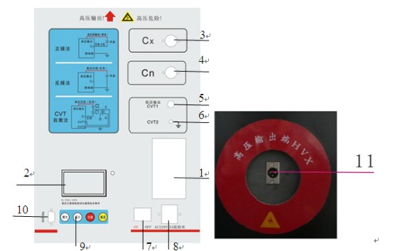 11.HV插座:高壓引出端子,由高壓電纜連接,接試品高壓端。輸出10kV高壓。
