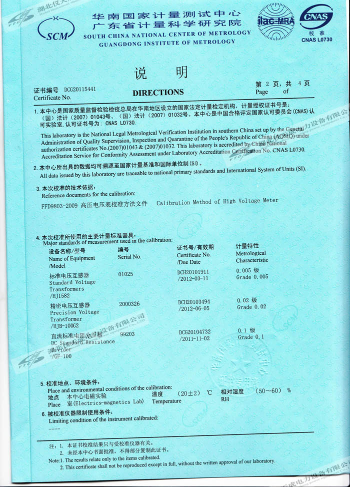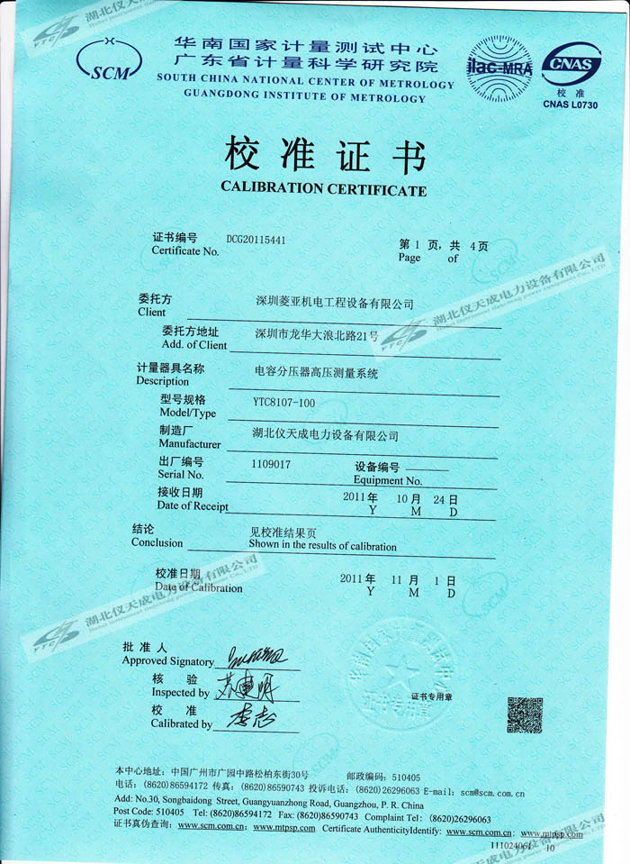 轉(zhuǎn)載:"YTC8107-100電容分壓器高壓測(cè)量系統(tǒng)的資質(zhì)證書(shū)" 請(qǐng)注明來(lái)源于儀天成電力。 更多技術(shù)問(wèn)題請(qǐng)致電儀天成電力客戶(hù)服務(wù):027-87876585,技術(shù)部專(zhuān)線:027-87876585,在線客服:719388481